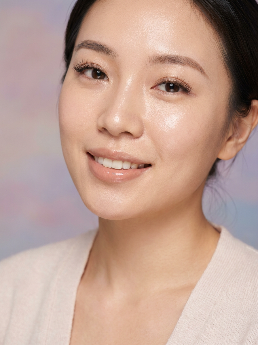 close-up of Beauty shot of model featuring dewy skin, natural makeup look with nude lips and fluttery lashes. set against a soft, pastel background