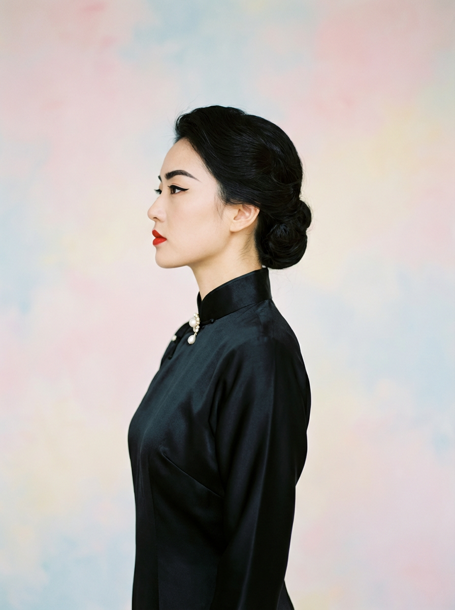 close-up of Elegant profile shot of a model with classic Hollywood makeup, featuring bold eyebrows and red lips. set against a soft, pastel background