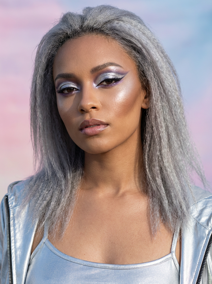 close-up of Futuristic makeup with metallic glossy eyeshadow and sharp contouring. set against a soft, pastel background