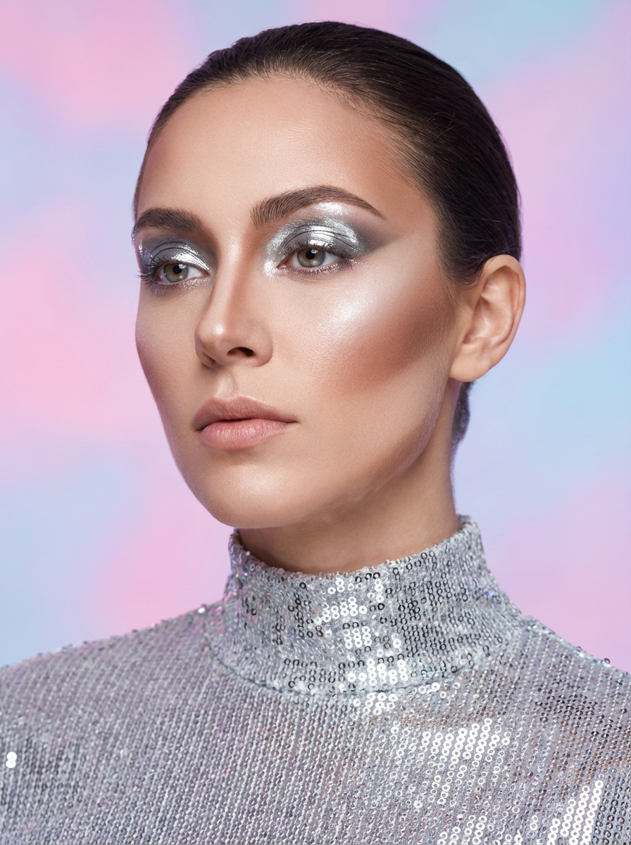 close-up of Futuristic makeup with metallic glossy eyeshadow and sharp contouring. set against a soft, pastel background