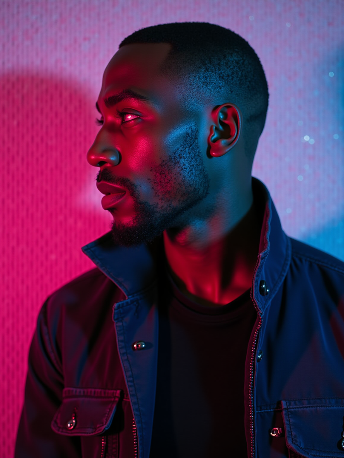 close up of model looking to the left. The model is wearing a dark jacket over a black shirt. The lighting is dramatic with blue and pink tones, creating a striking contrast against a textured pink background.