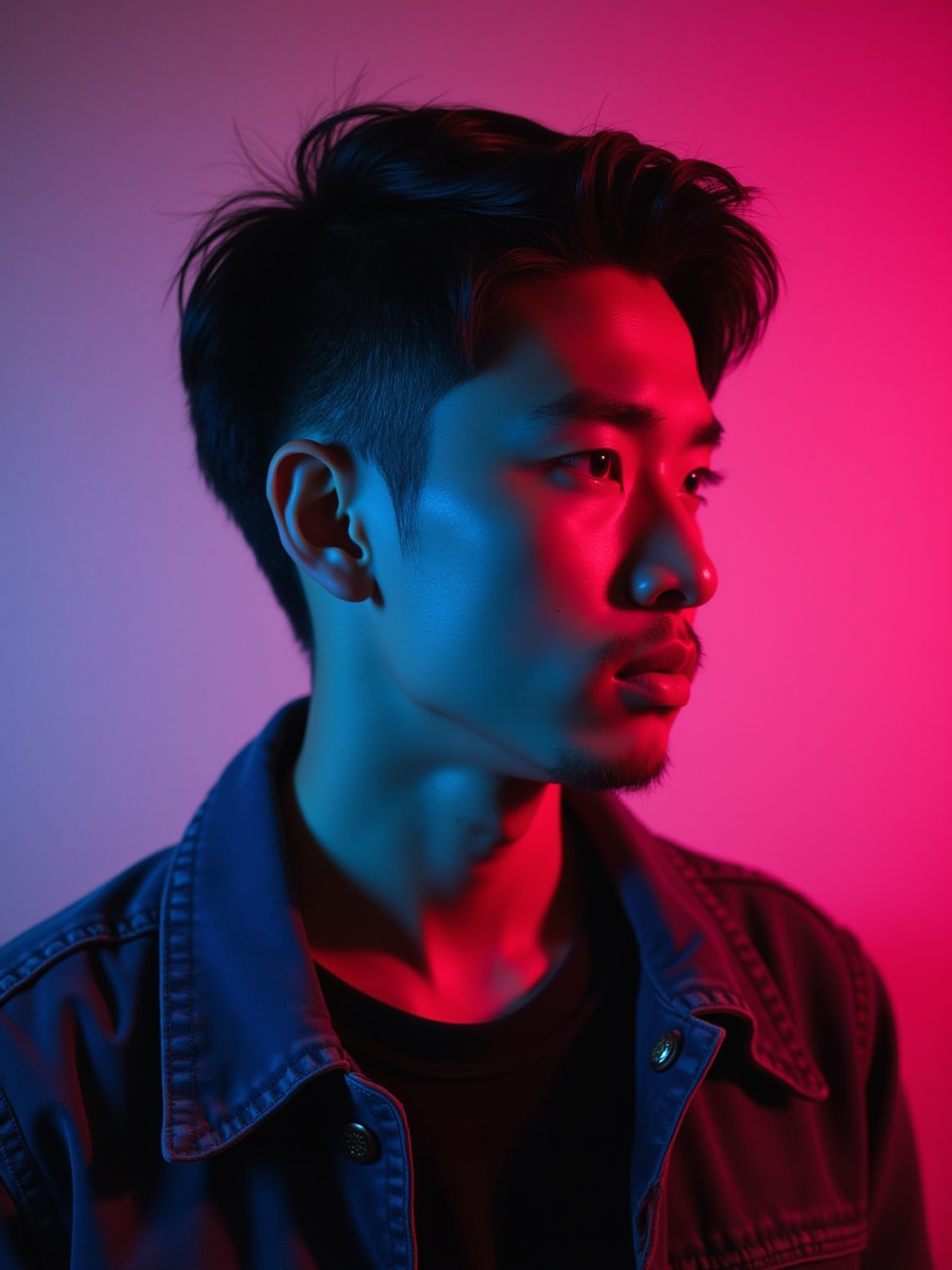 close up of model looking to the left. The model is wearing a dark jacket over a black shirt. The lighting is dramatic with blue and pink tones, creating a striking contrast against a textured pink background.