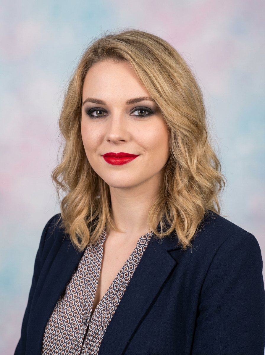 close-up of Model with a bold red lipstick and smokey eye makeup, set against a soft, pastel background