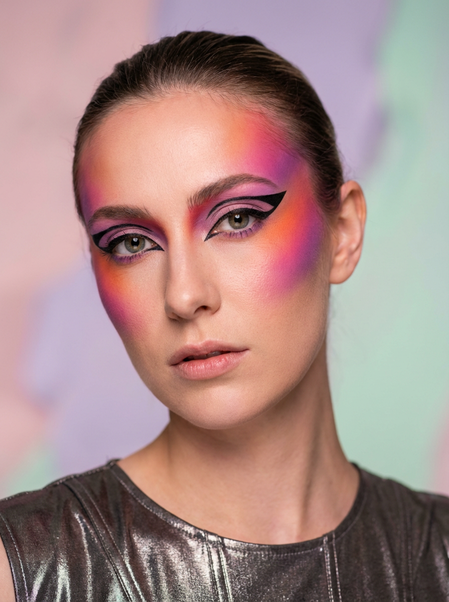 close-up of Model with an avant-garde makeup look, including graphic eyeliner shapes and vibrant cheek colors. set against a soft, pastel background