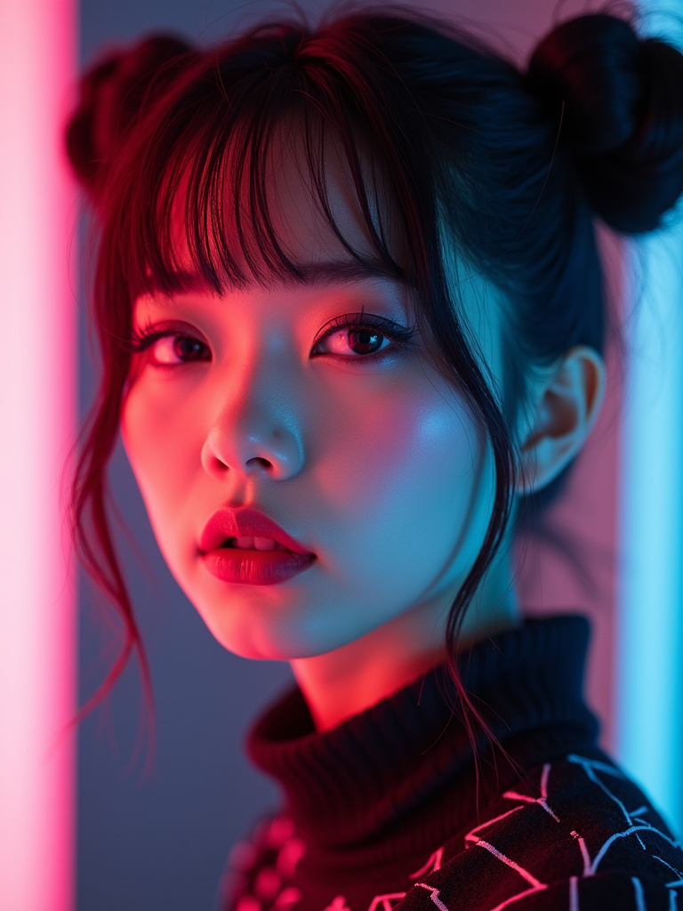 Close-up of model as an E-Girl portrait with soft goth makeup. Blush-heavy cheeks, glossy lips, dramatic eyeliner, space buns hairstyle . Neon cyberpunk background.