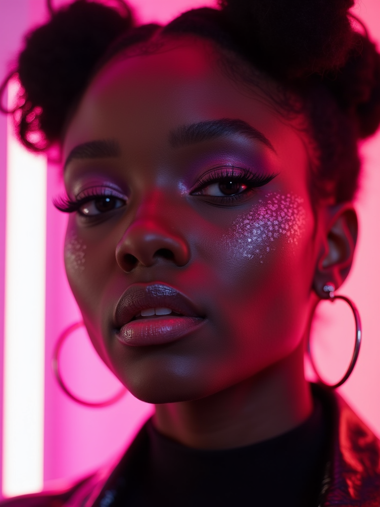 Close-up of model as an E-Girl portrait with soft goth makeup. Blush-heavy cheeks, glossy lips, dramatic eyeliner, space buns hairstyle . Neon cyberpunk background.