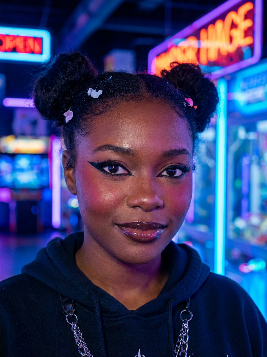 Close-up of model as an E-Girl portrait with soft goth makeup. Blush-heavy cheeks, glossy lips, dramatic eyeliner, space buns hairstyle . Neon cyberpunk background.