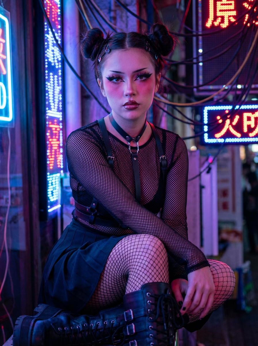 Close-up of model as an E-Girl portrait with soft goth makeup. Blush-heavy cheeks, glossy lips, dramatic eyeliner, space buns hairstyle . Neon cyberpunk background.