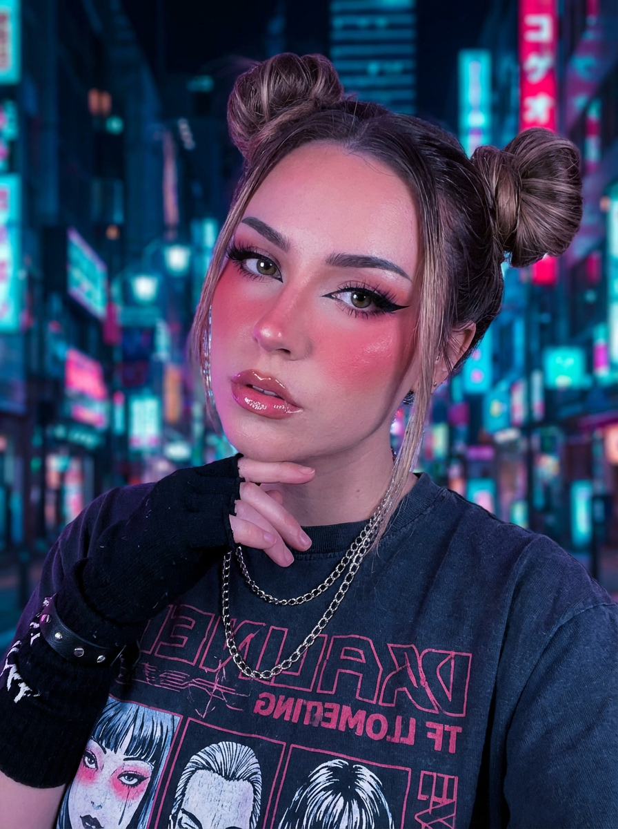 Close-up of model as an E-Girl portrait with soft goth makeup. Blush-heavy cheeks, glossy lips, dramatic eyeliner, space buns hairstyle . Neon cyberpunk background.