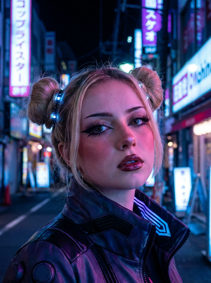 Close-up of model as an E-Girl portrait with soft goth makeup. Blush-heavy cheeks, glossy lips, dramatic eyeliner, space buns hairstyle . Neon cyberpunk background.