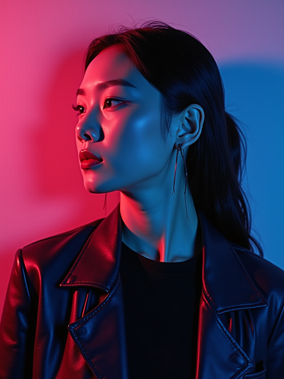close up of model looking to the left. The model is wearing a dark jacket over a black shirt. The lighting is dramatic with blue and pink tones, creating a striking contrast against a textured pink background.