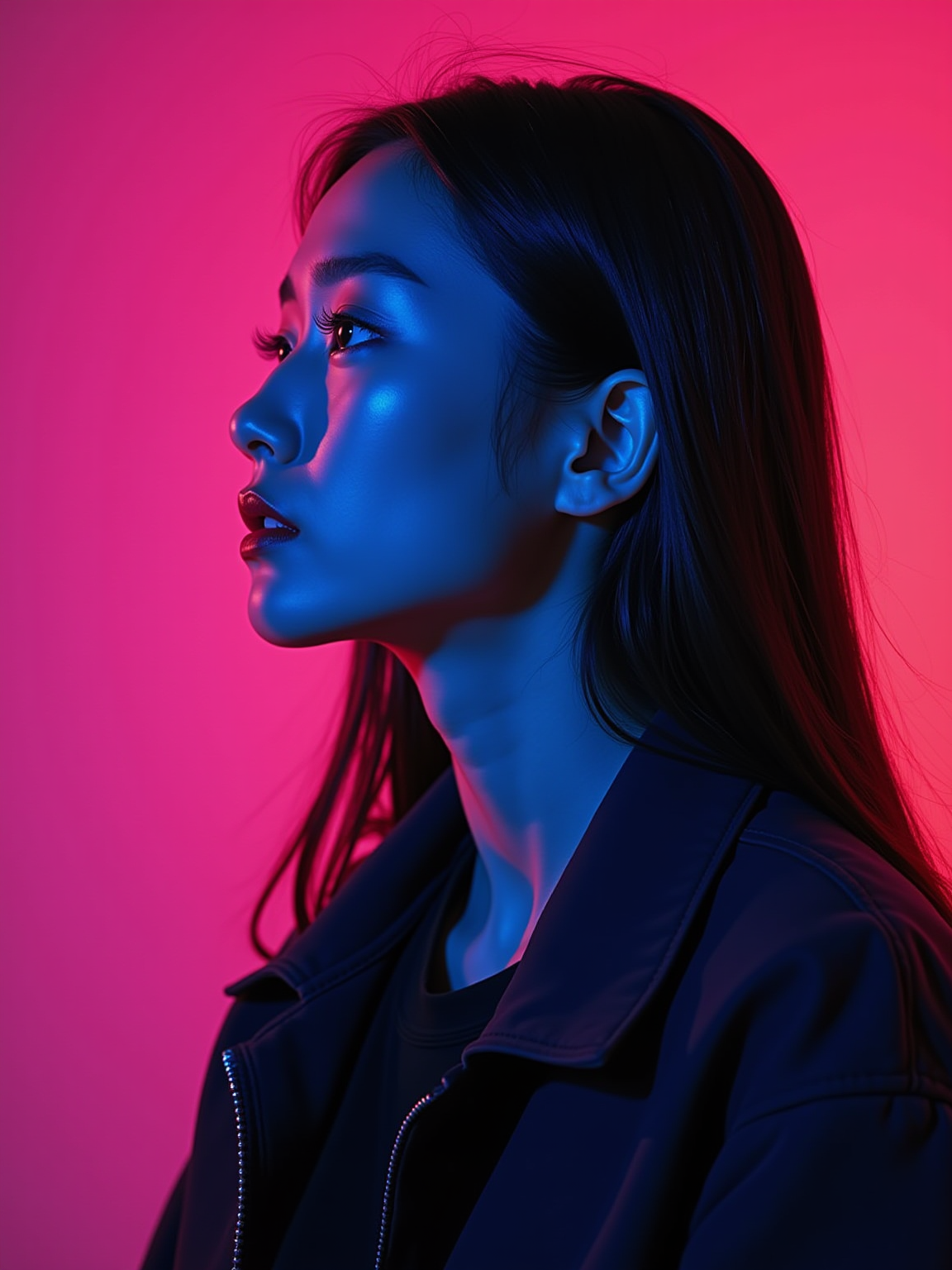 close up of model looking to the left. The model is wearing a dark jacket over a black shirt. The lighting is dramatic with blue and pink tones, creating a striking contrast against a textured pink background.