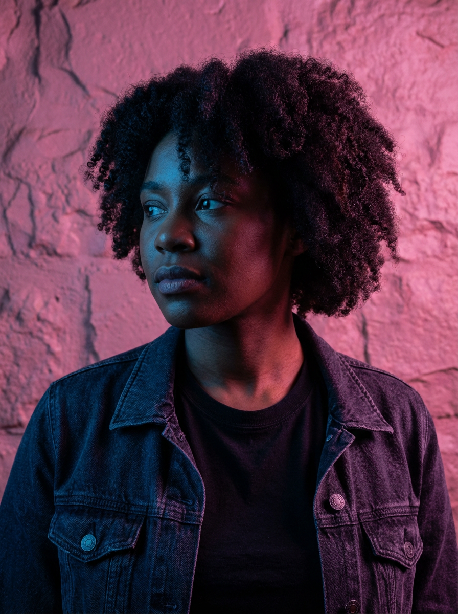 close up of model looking to the left. The model is wearing a dark jacket over a black shirt. The lighting is dramatic with blue and pink tones, creating a striking contrast against a textured pink background.