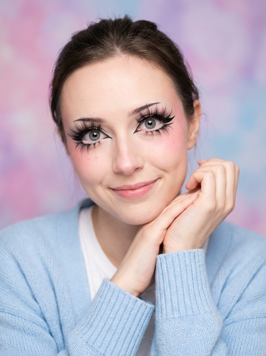 close-up of model showcasing an Korean-style manga makeup look on model, featuring oversized, dramatically long eyelashes that create a wide-eyed, whimsical appearance. The look is completed with bold, graphic eyeliner and a subtle blush to enhance the youthful and playful vibe. set against a soft, pastel background