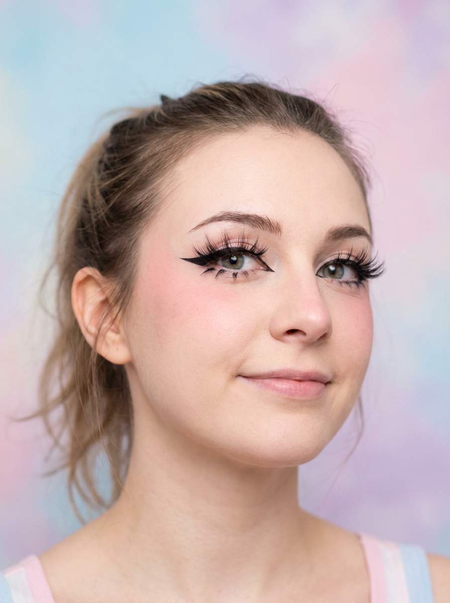 close-up of model showcasing an Korean-style manga makeup look on model, featuring oversized, dramatically long eyelashes that create a wide-eyed, whimsical appearance. The look is completed with bold, graphic eyeliner and a subtle blush to enhance the youthful and playful vibe. set against a soft, pastel background