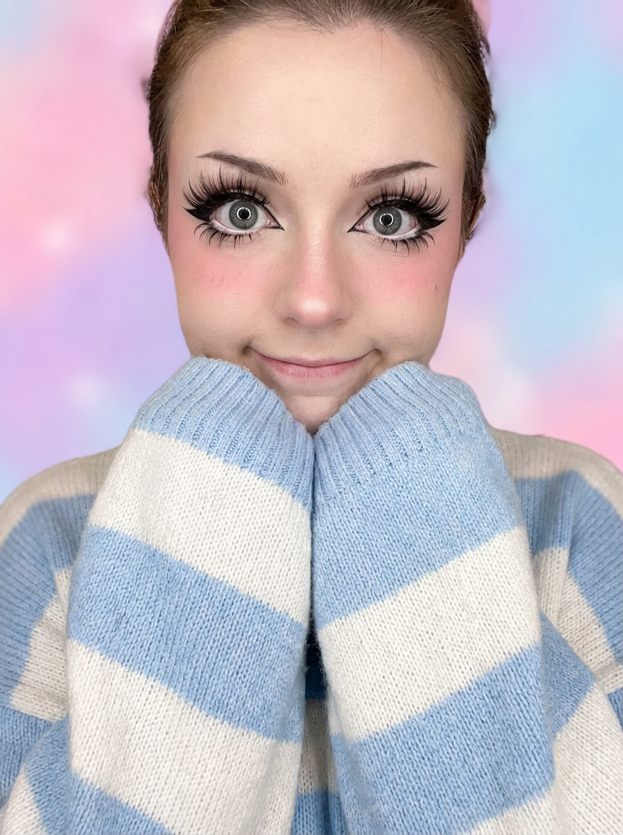 close-up of model showcasing an Korean-style manga makeup look on model, featuring oversized, dramatically long eyelashes that create a wide-eyed, whimsical appearance. The look is completed with bold, graphic eyeliner and a subtle blush to enhance the youthful and playful vibe. set against a soft, pastel background