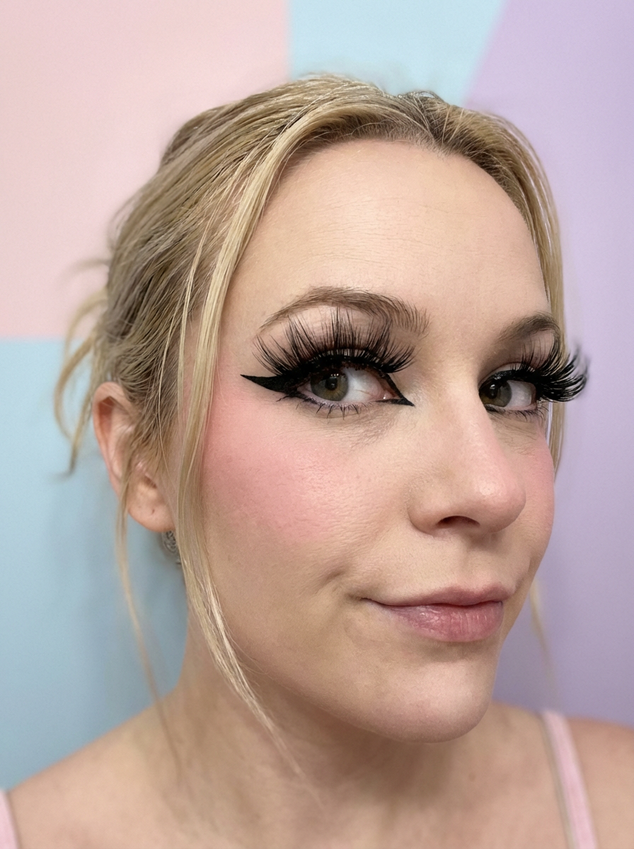 close-up of model showcasing an Korean-style manga makeup look on model, featuring oversized, dramatically long eyelashes that create a wide-eyed, whimsical appearance. The look is completed with bold, graphic eyeliner and a subtle blush to enhance the youthful and playful vibe. set against a soft, pastel background