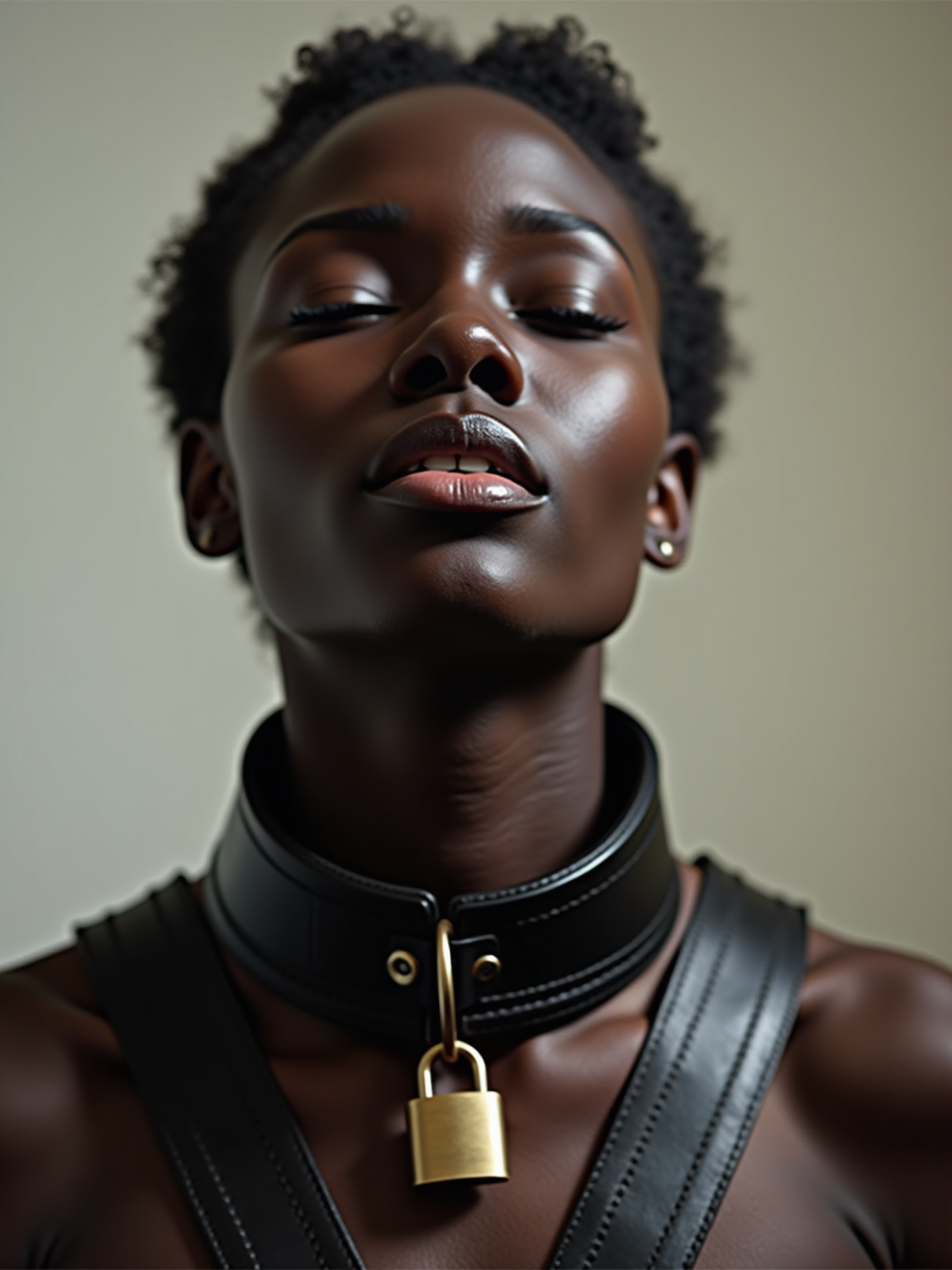 Related photoswoman lying on a velvet chaise, wearing black leather straps connected by gold rings, soft rope wrapped loosely around wrists. room lit by candlelight and dark shadows.close-up of woman wearing a heavy leather collar with a padlock and wide chest strap. her eyes are closed, lips glossed, and head tilted slightly. background is minimalist and softly lit.woman lying on a velvet chaise, wearing black leather straps connected by gold rings, soft rope wrapped loosely around wrists. room lit by candlelight and dark shadows.close up of woman with a bold red lipstick and smokey eye makeup. set against a soft, pastel backgroundman as a Doctor in Hospitalman on a hiking trail, overlooking a breathtaking mountain landscape