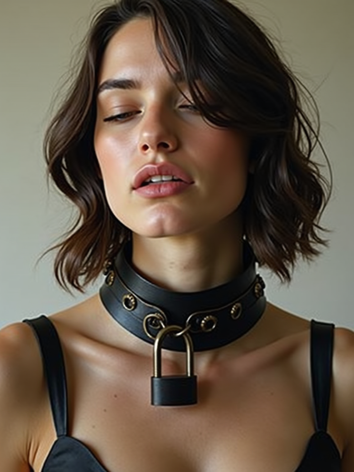 close-up of model wearing a heavy leather collar with a padlock and wide chest strap. her eyes are closed, lips glossed, and head tilted slightly. background is minimalist and softly lit.