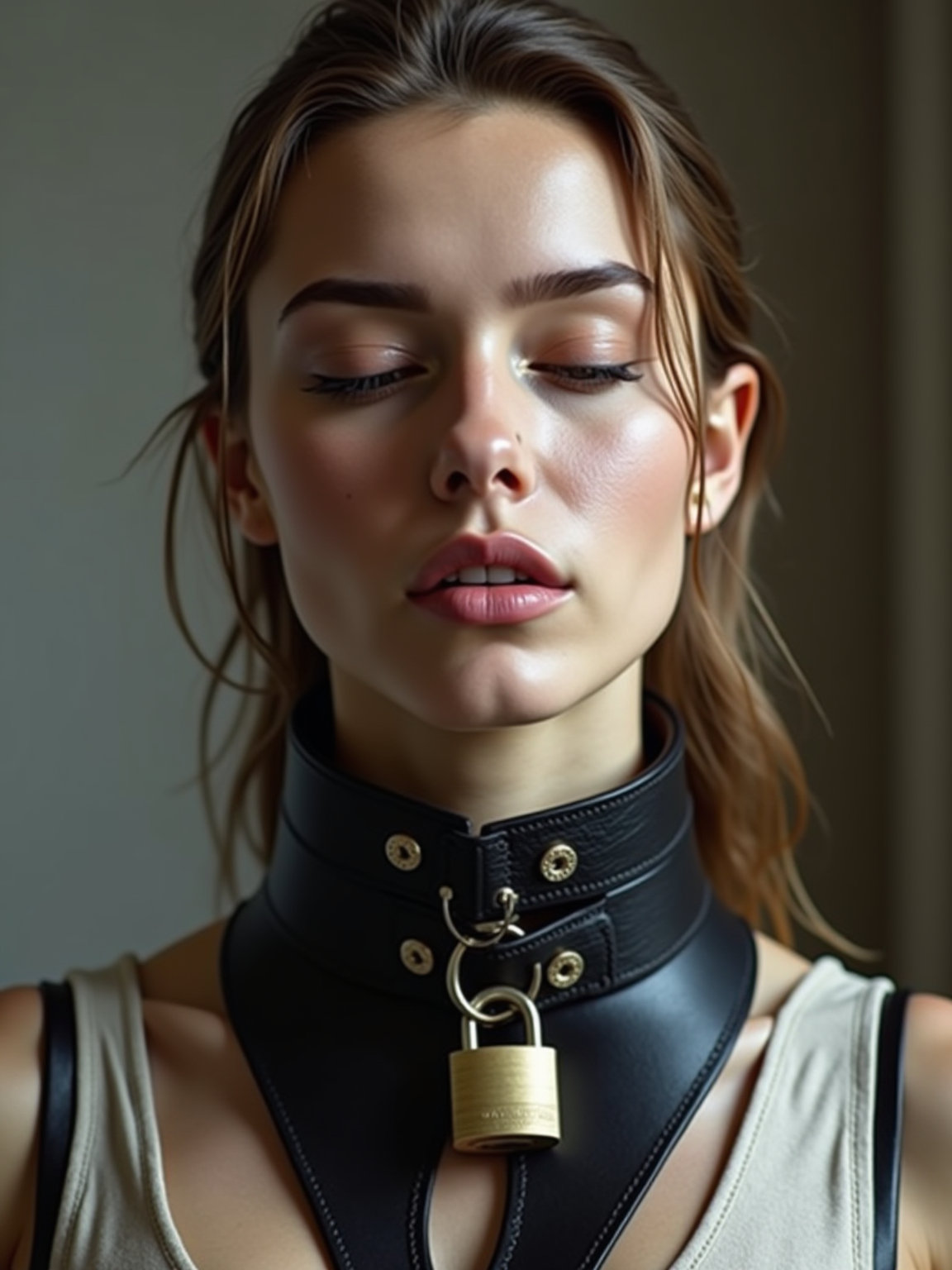 close-up of model wearing a heavy leather collar with a padlock and wide chest strap. her eyes are closed, lips glossed, and head tilted slightly. background is minimalist and softly lit.