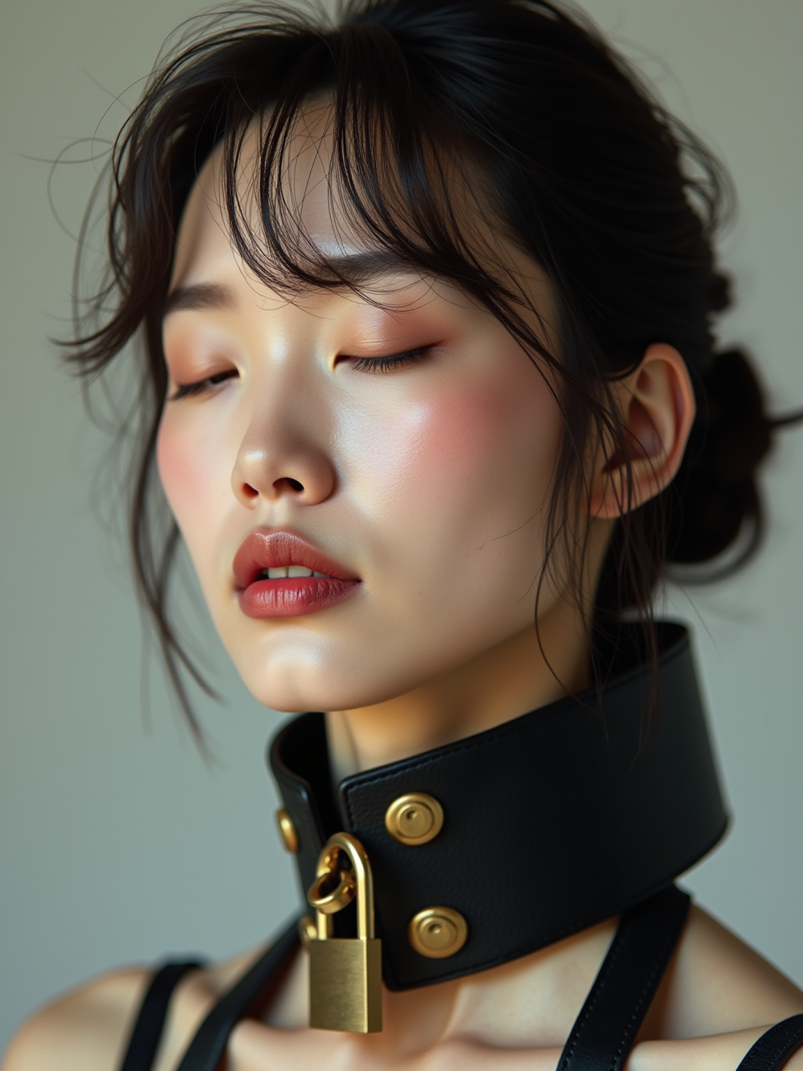close-up of model wearing a heavy leather collar with a padlock and wide chest strap. her eyes are closed, lips glossed, and head tilted slightly. background is minimalist and softly lit.