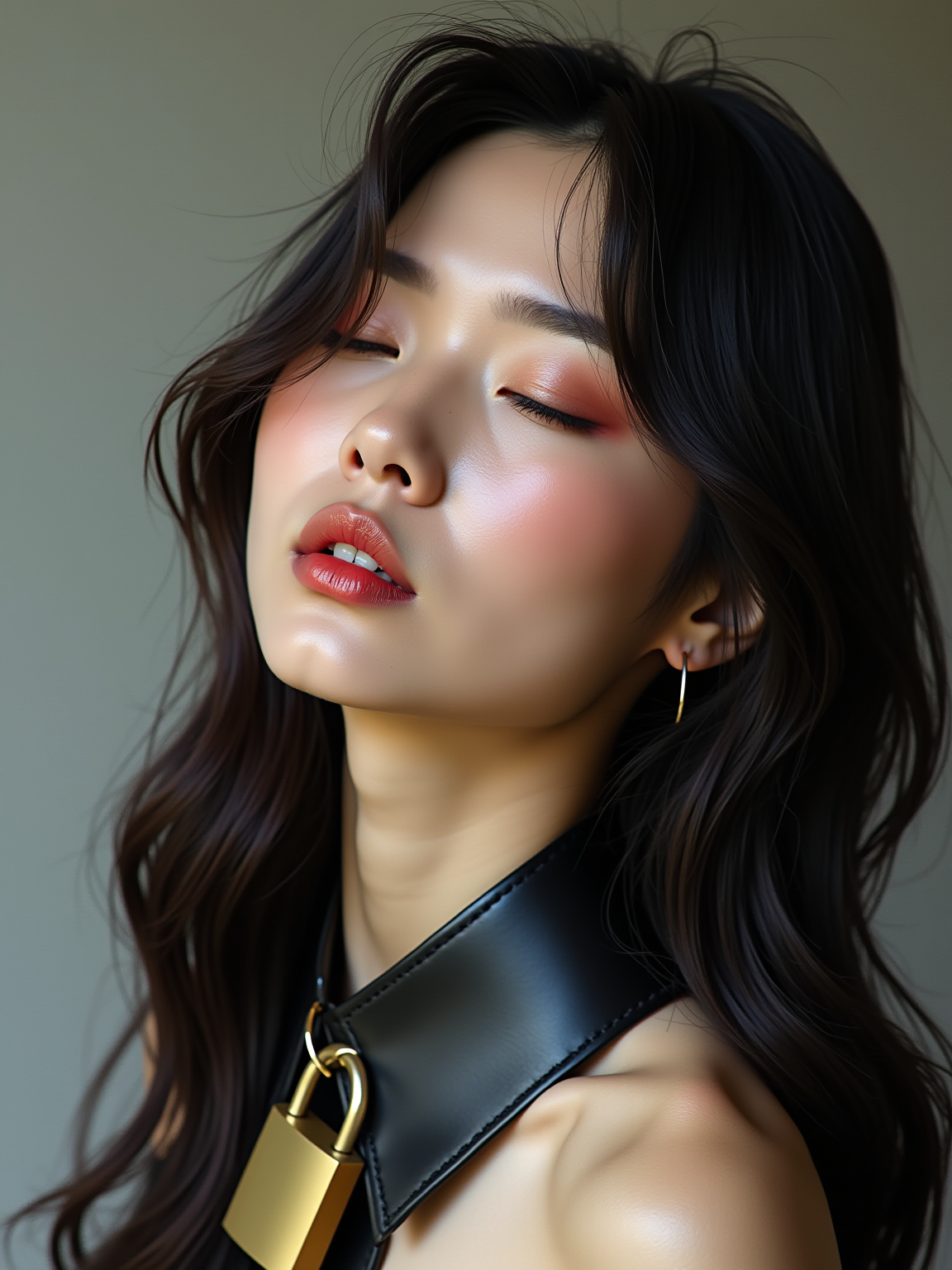 close-up of model wearing a heavy leather collar with a padlock and wide chest strap. her eyes are closed, lips glossed, and head tilted slightly. background is minimalist and softly lit.