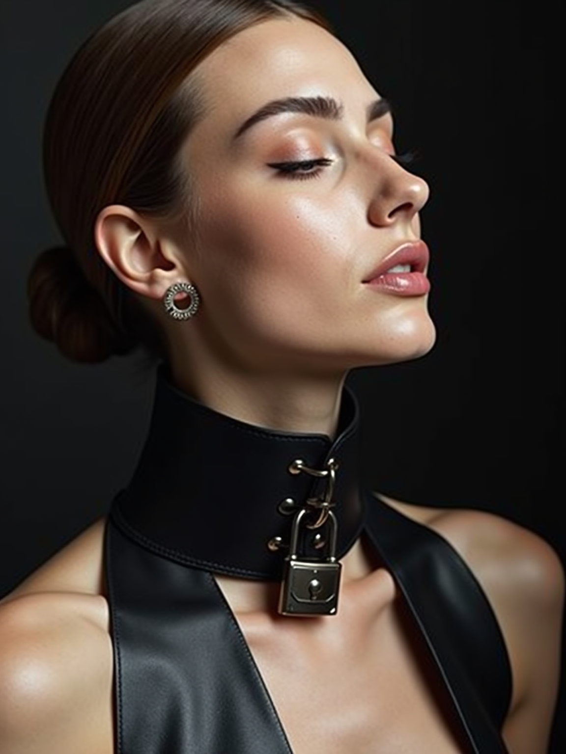 close-up of model wearing a wide black leather collar with a padlock and a sleek chest strap. all materials are smooth and fitted, with no decoration. her lips are glossed, eyes closed, and head tilted slightly. background is moody and elegant.