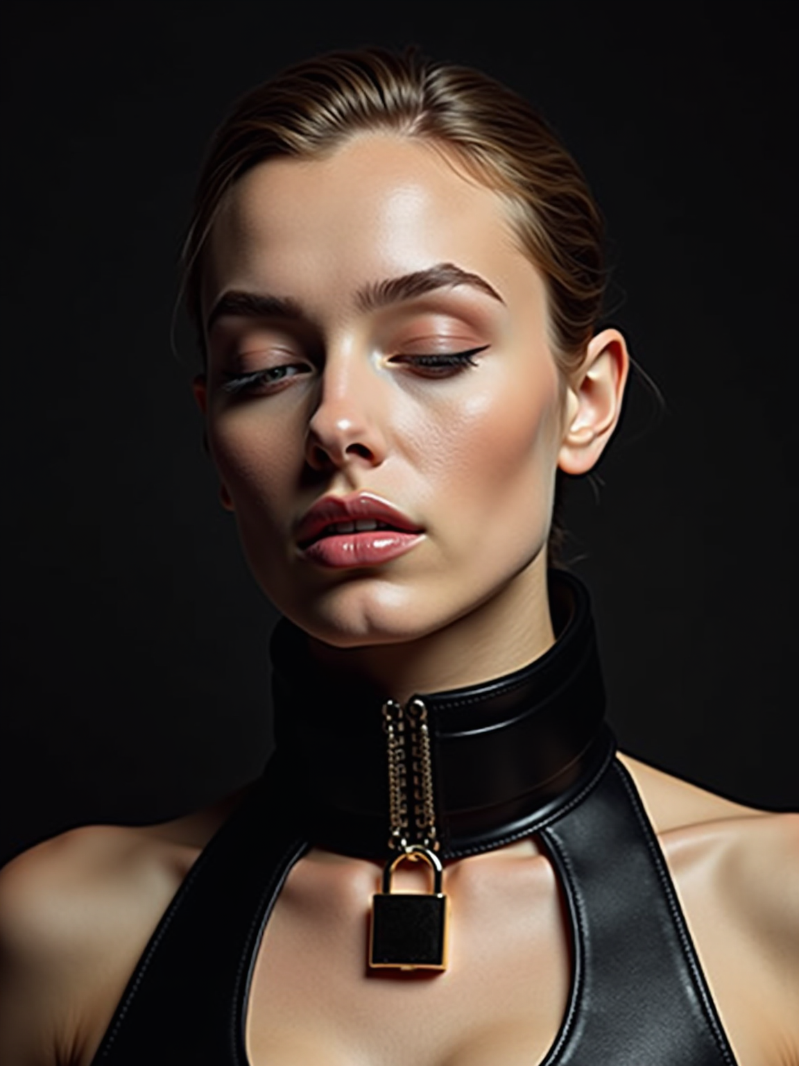 close-up of model wearing a wide black leather collar with a padlock and a sleek chest strap. all materials are smooth and fitted, with no decoration. her lips are glossed, eyes closed, and head tilted slightly. background is moody and elegant.