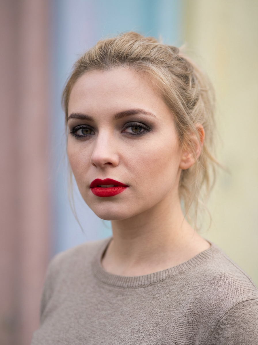 close up of model with a bold red lipstick and smokey eye makeup. set against a soft, pastel background