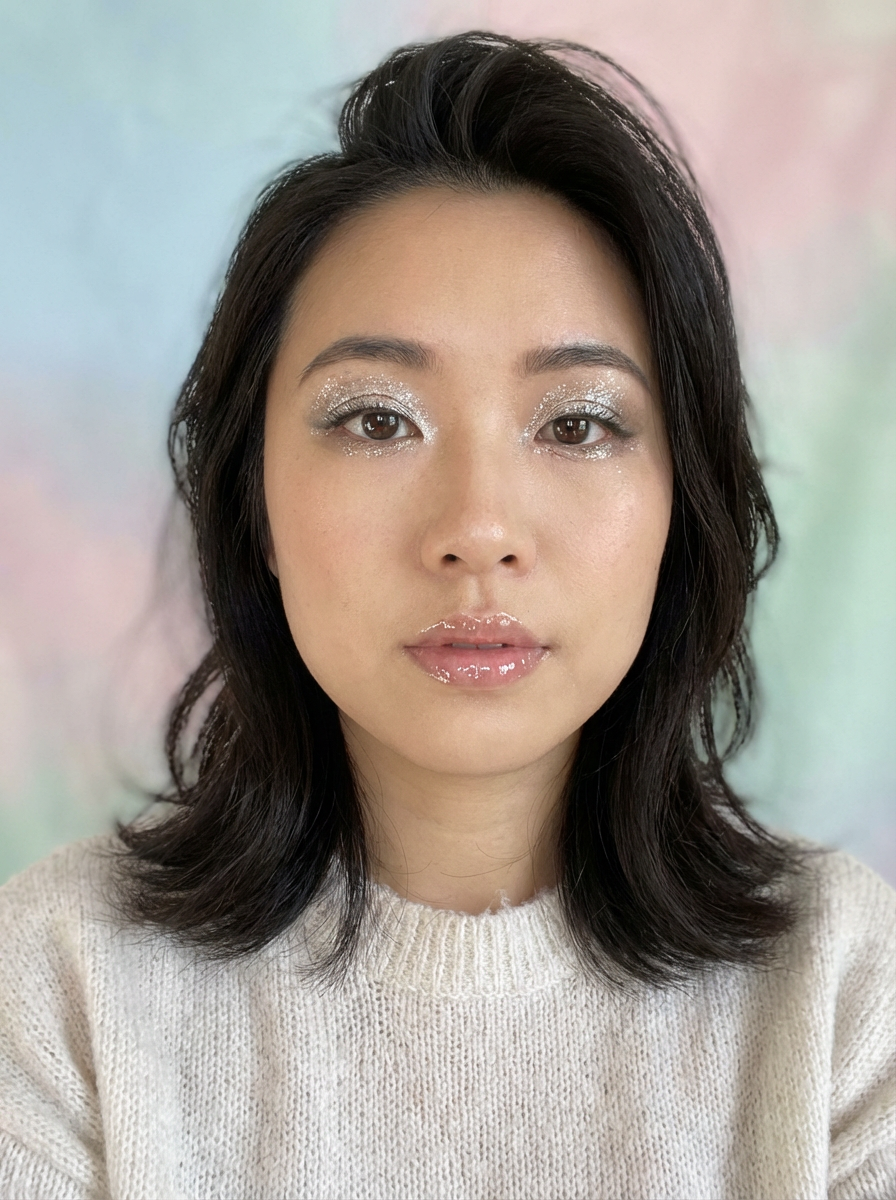 close-up of model with glittery eye shadow and high-shine gloss, set against a soft, pastel background