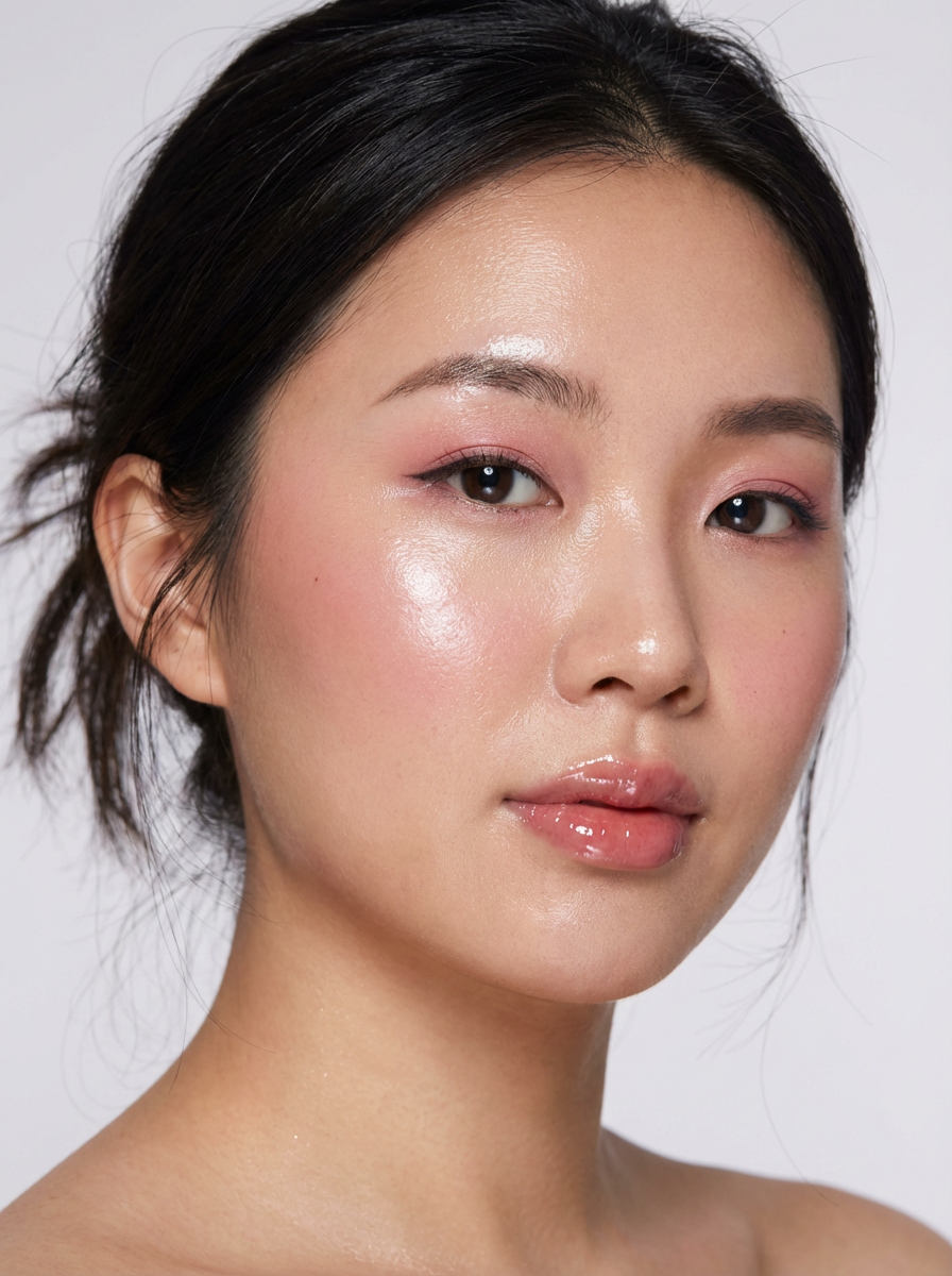 close up of model with glossy reflective skin with blush and 3d lipgloss. soft pink eyeshadow. eyeliner.
