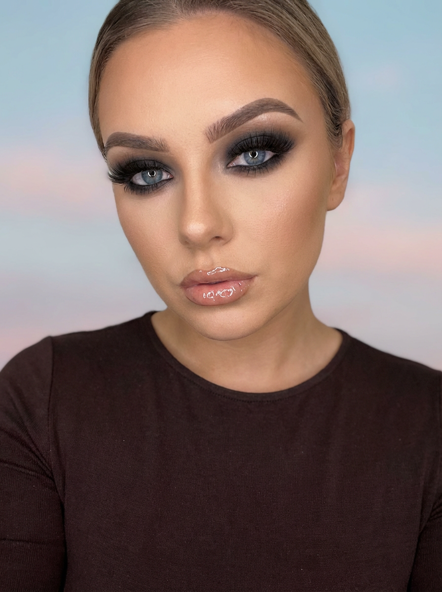 close up of model with heavy smokey eye makeup, fake big eyelashes with lash lift. dark black eyeshadow and thick eyeliner. contoured eyebrows. glossy reflective lipgloss. blue eye lenses. set against a soft, pastel background.