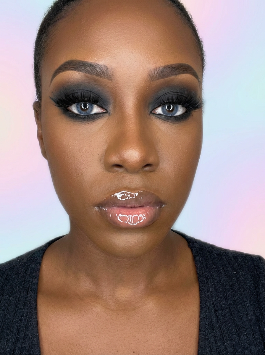 close up of model with heavy smokey eye makeup, fake big eyelashes with lash lift. dark black eyeshadow and thick eyeliner. contoured eyebrows. glossy reflective lipgloss. blue eye lenses. set against a soft, pastel background.