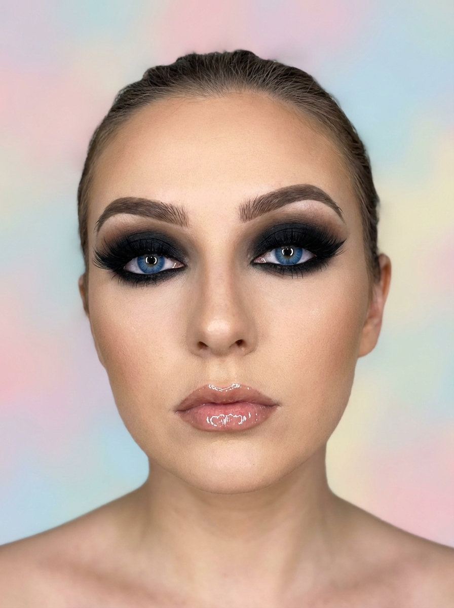 close up of model with heavy smokey eye makeup, fake big eyelashes with lash lift. dark black eyeshadow and thick eyeliner. contoured eyebrows. glossy reflective lipgloss. blue eye lenses. set against a soft, pastel background.