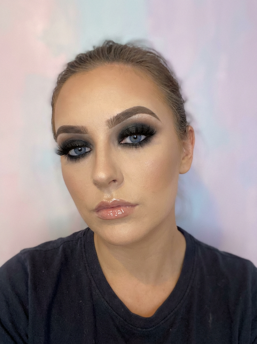 close up of model with heavy smokey eye makeup, fake big eyelashes with lash lift. dark black eyeshadow and thick eyeliner. contoured eyebrows. glossy reflective lipgloss. blue eye lenses. set against a soft, pastel background.