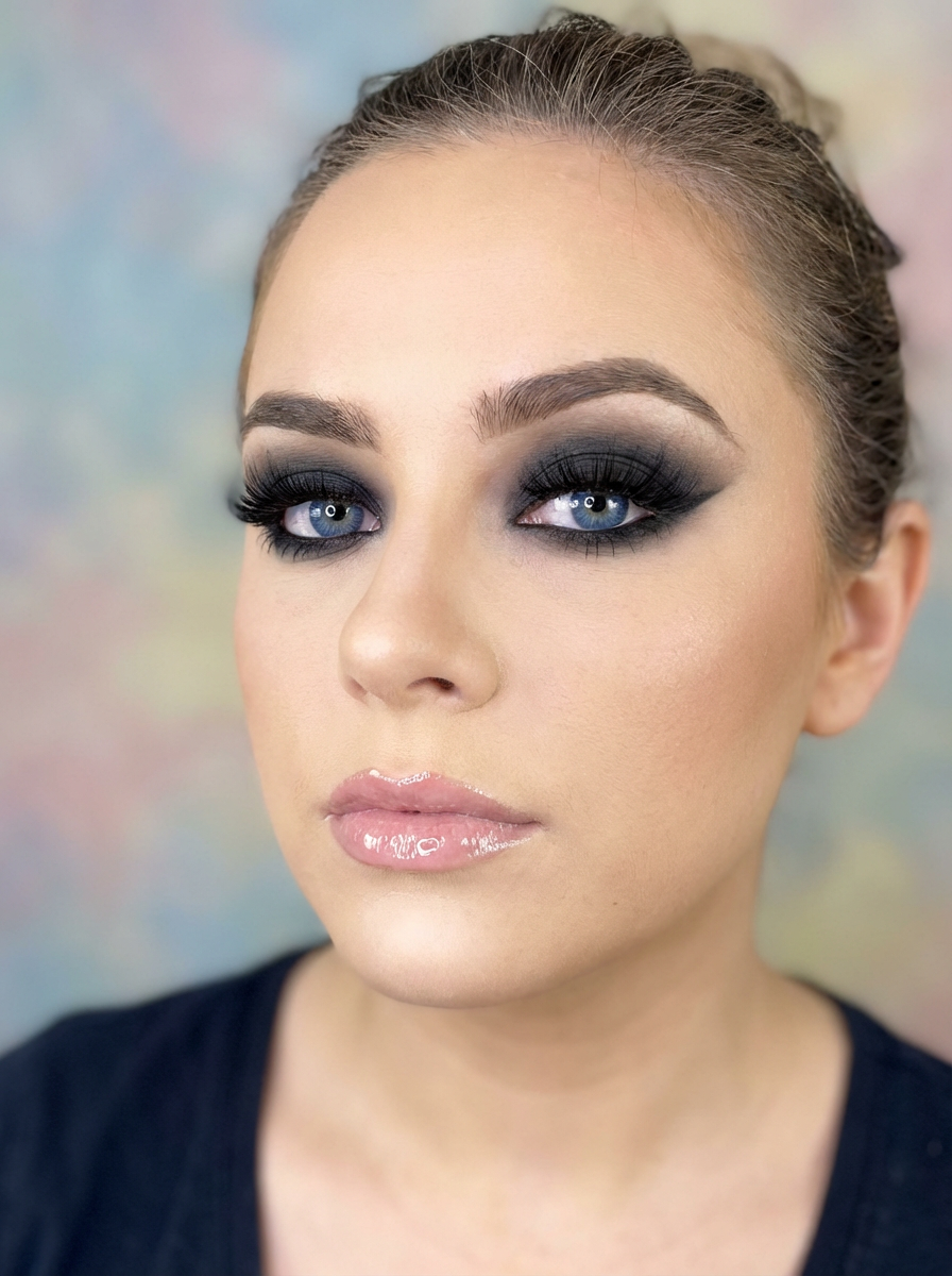 close up of model with heavy smokey eye makeup, fake big eyelashes with lash lift. dark black eyeshadow and thick eyeliner. contoured eyebrows. glossy reflective lipgloss. blue eye lenses. set against a soft, pastel background.