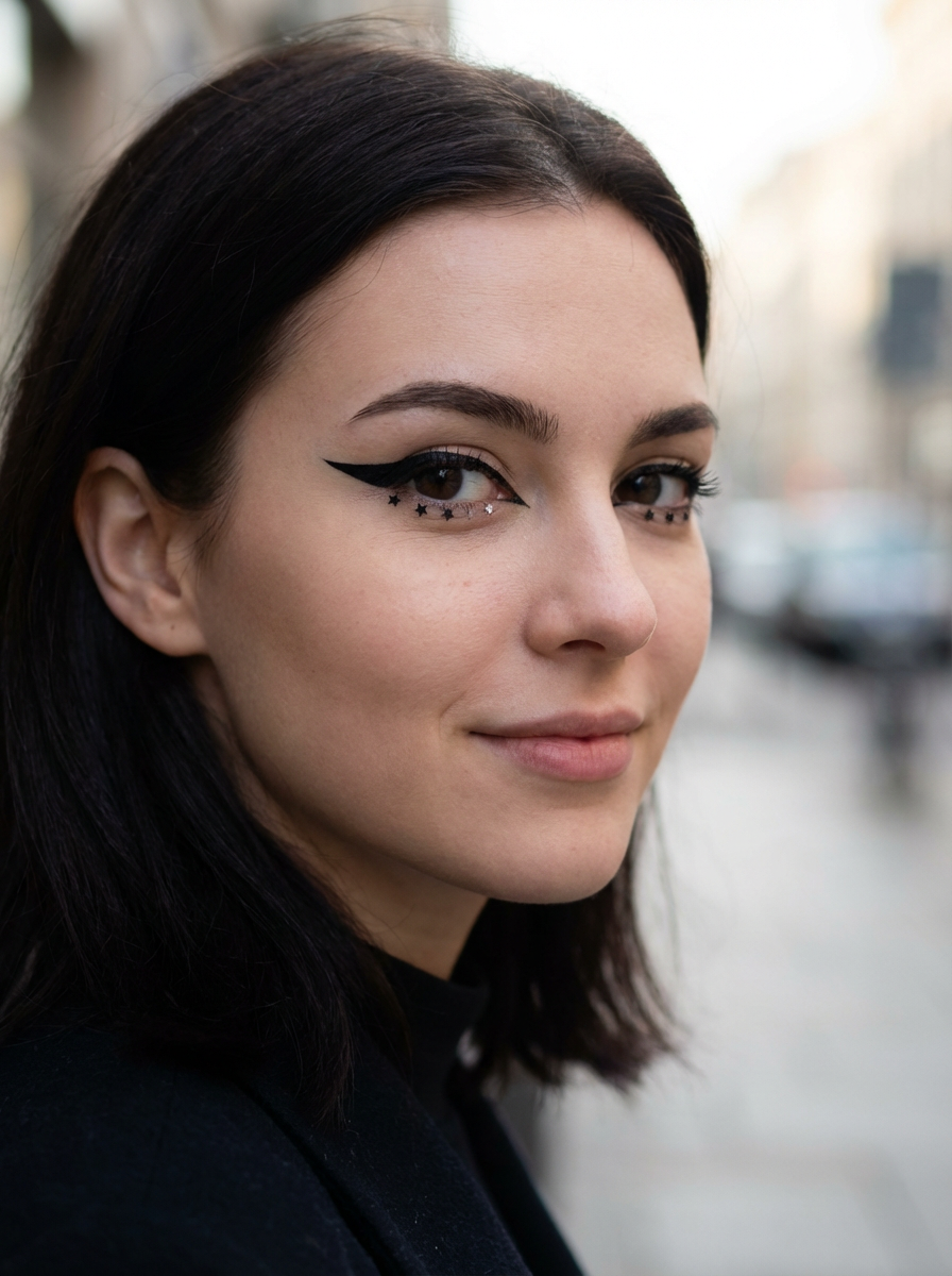 close up of model with thick eyeliner makeup. eyeliner above eye. star eye lashes