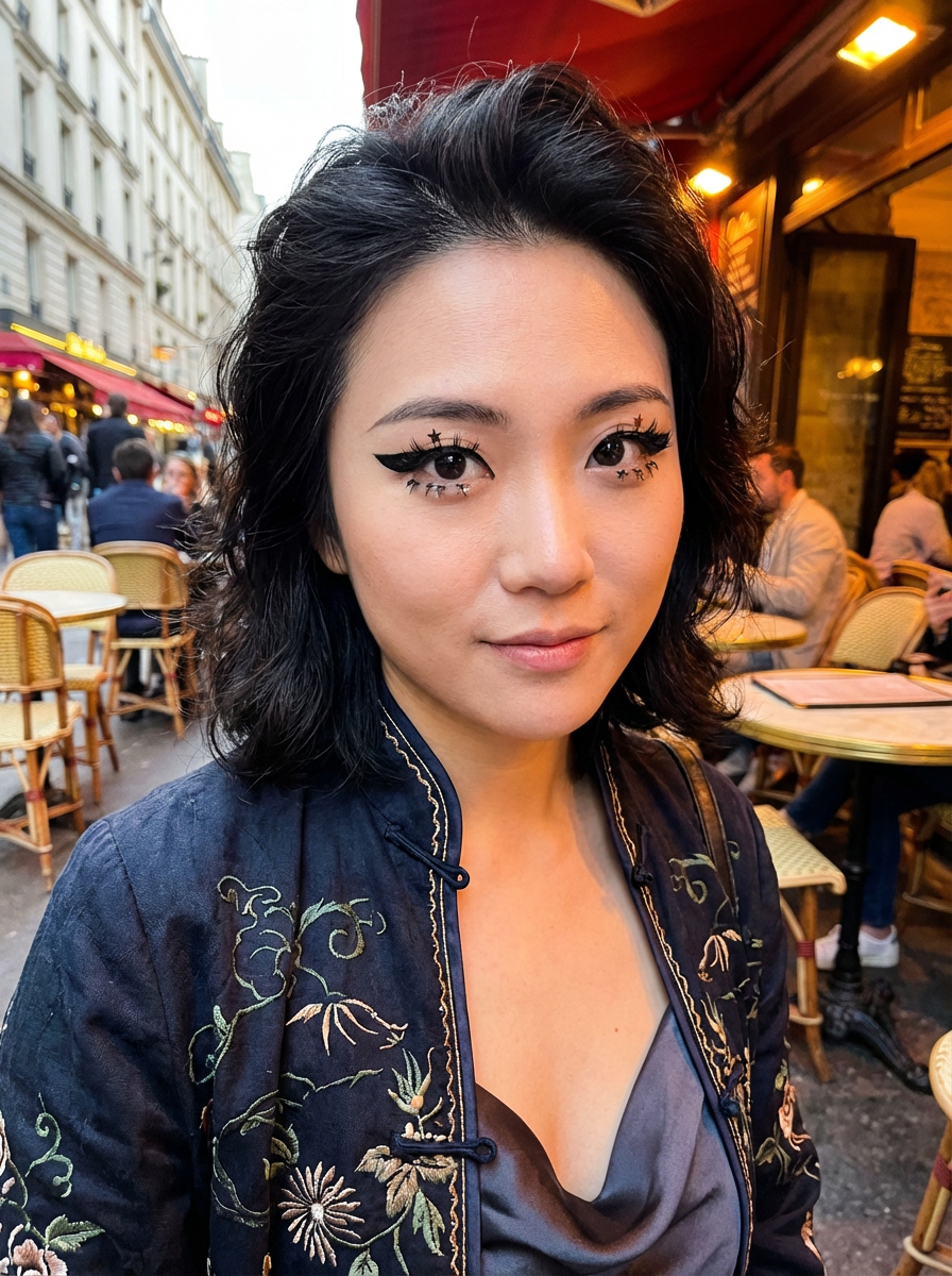 close up of model with thick eyeliner makeup. eyeliner above eye. star eye lashes