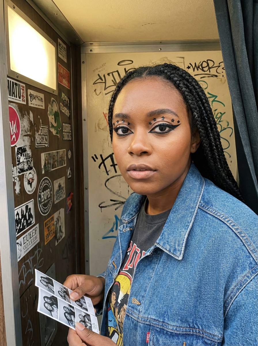 close up of model with thick eyeliner makeup. eyeliner above eye. star eye lashes