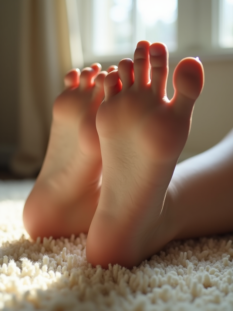 Close-up of model's feet resting on a plush carpet, also showing the bottom of feet, with soft natural light streaming through a nearby window, creating a warm and inviting atmosphere.