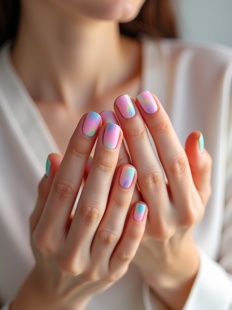 close-up photo of pastel rainbow french tip nails, hands posed gracefully, soft lighting, minimal background, professional beauty photo, high detail, perfect for salon marketing