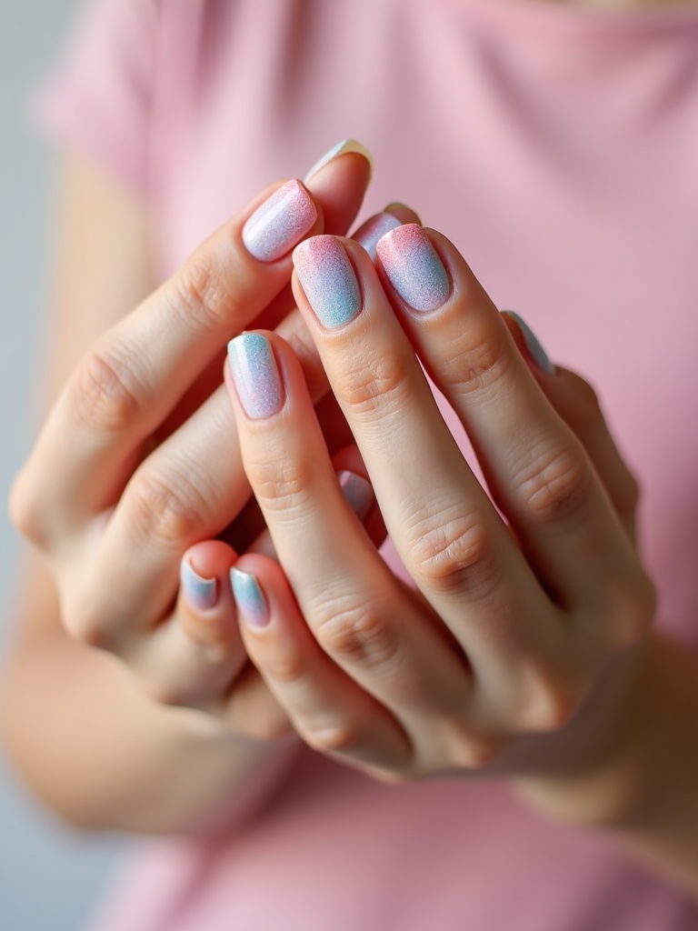 close-up photo of pastel rainbow french tip nails, hands posed gracefully, soft lighting, minimal background, professional beauty photo, high detail, perfect for salon marketing