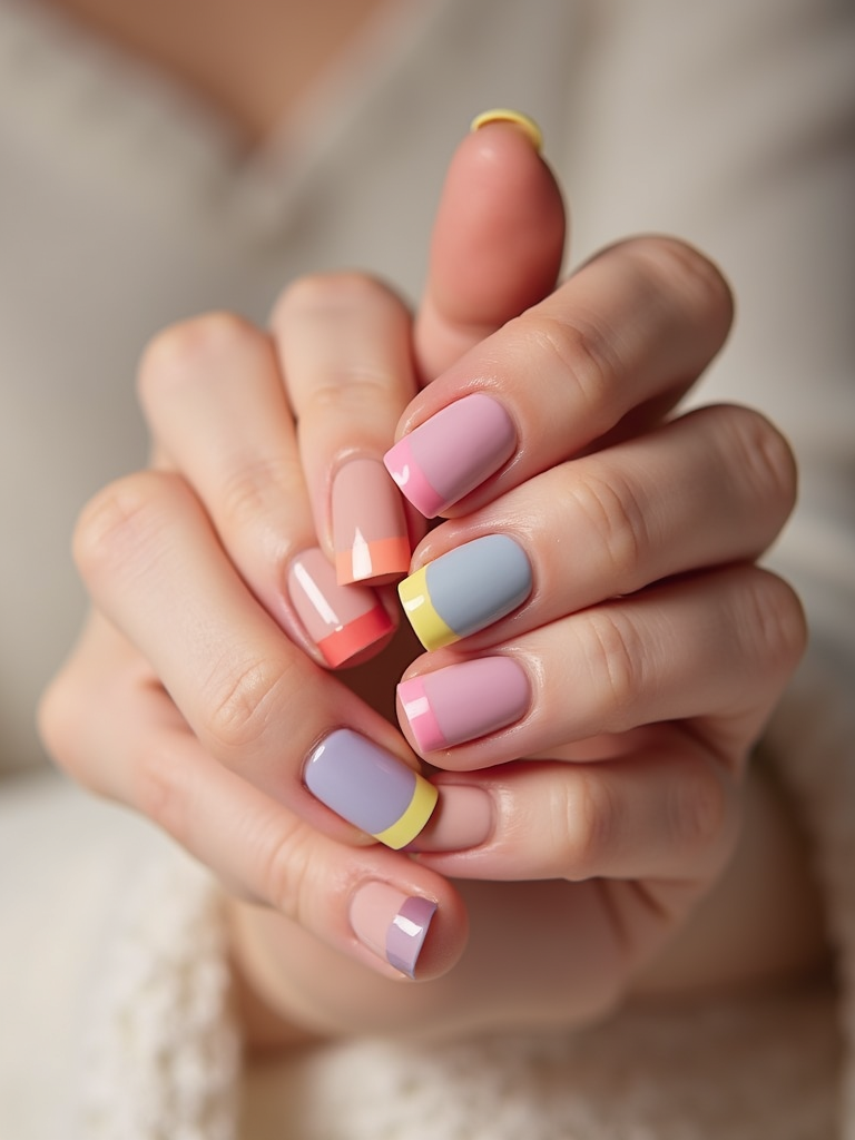 close-up photo of pastel rainbow french tip nails, hands posed gracefully, soft lighting, minimal background, professional beauty photo, high detail, perfect for salon marketing