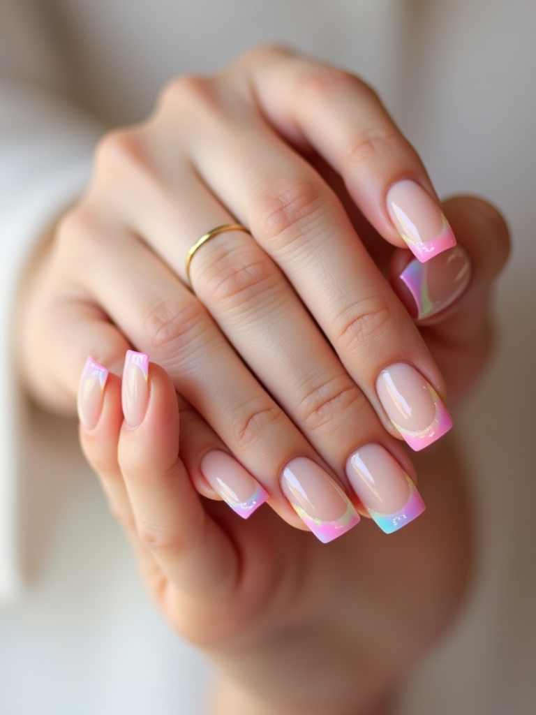 close-up photo of pastel rainbow french tip nails, hands posed gracefully, soft lighting, minimal background, professional beauty photo, high detail, perfect for salon marketing
