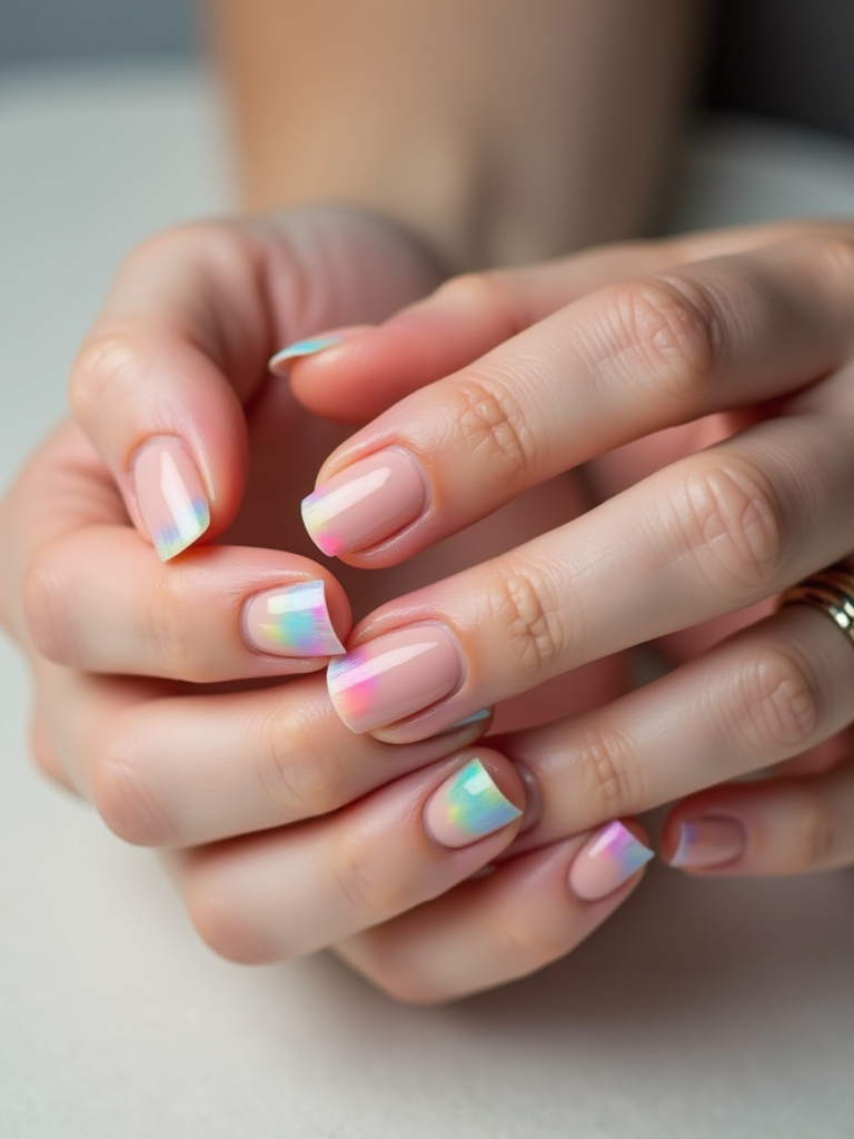 close-up photo of pastel rainbow french tip nails, hands posed gracefully, soft lighting, minimal background, professional beauty photo, high detail, perfect for salon marketing