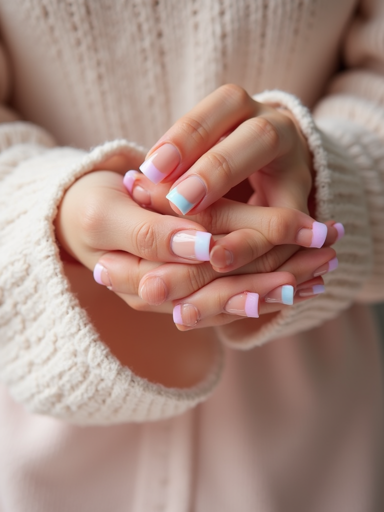 close-up photo of pastel rainbow french tip nails, hands posed gracefully, soft lighting, minimal background, professional beauty photo, high detail, perfect for salon marketing
