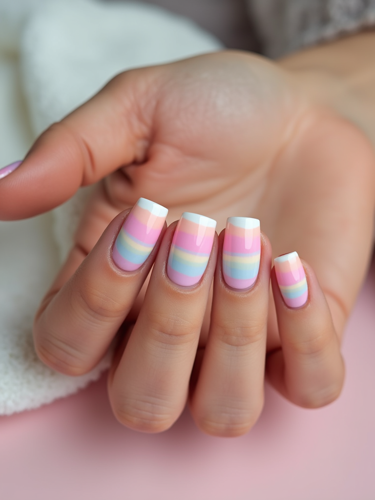 close-up photo of pastel rainbow french tip nails, hands posed gracefully, soft lighting, minimal background, professional beauty photo, high detail, perfect for salon marketing