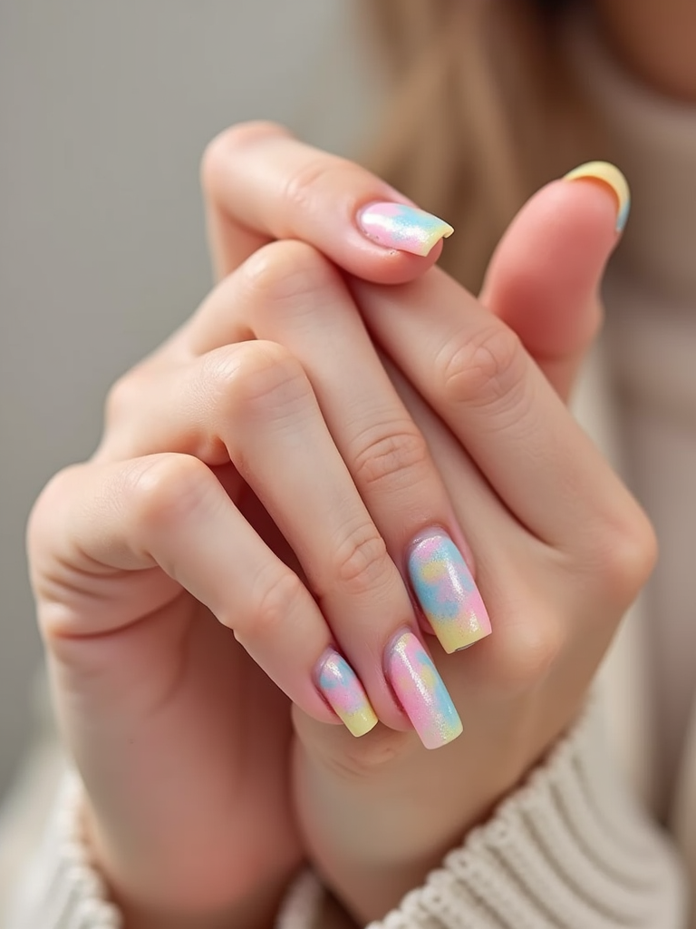 close-up photo of pastel rainbow french tip nails, hands posed gracefully, soft lighting, minimal background, professional beauty photo, high detail, perfect for salon marketing