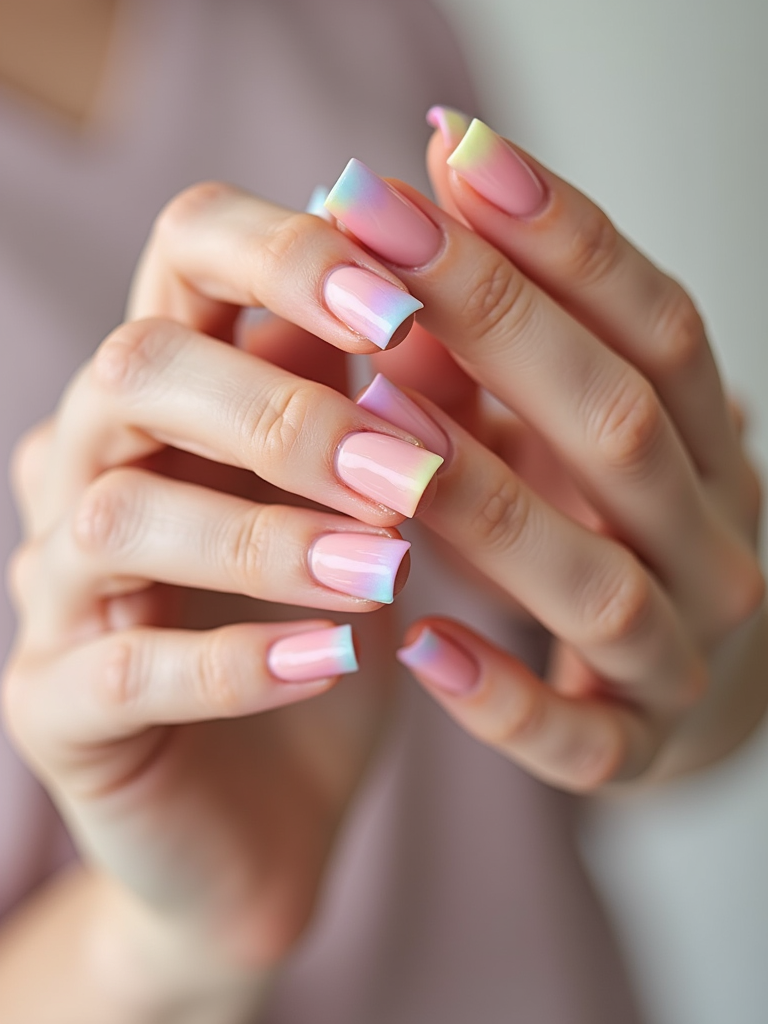 close-up photo of pastel rainbow french tip nails, hands posed gracefully, soft lighting, minimal background, professional beauty photo, high detail, perfect for salon marketing