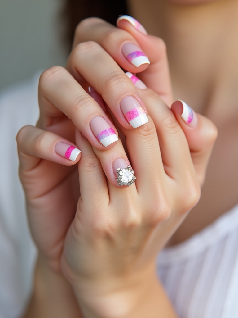 close-up photo of pastel rainbow french tip nails, hands posed gracefully, soft lighting, minimal background, professional beauty photo, high detail, perfect for salon marketing